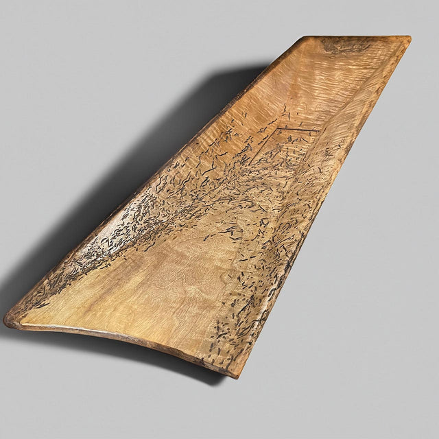 The Symphony Bowl, in Walnut (51x12x3 inches), is a visual masterpiece notable for its remarkable length and intricate natural grains. The subtle mottling adds depth to the visual appeal, creating a captivating interplay of textures. This exceptional bowl is accompanied by a presentation box made of Oak, Walnut, and embellished with raffia, further enhancing its aesthetic appeal.