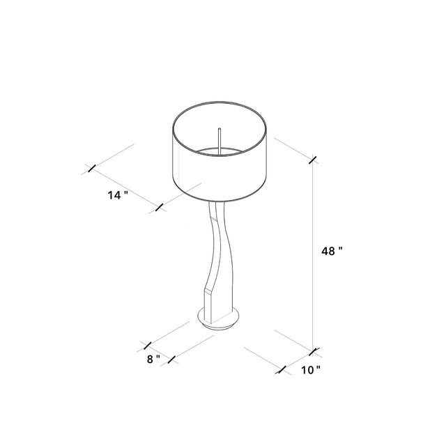 Immerse your space in the warm, inviting glow of this remarkable floor lamp. Crafted from wood, this lamp stands at a height of 48 inches, with a distinctive lampshade perched atop, measuring 14 inches in diameter. The lamp's wooden body is anything but ordinary. While it might seem like a simple, straight piece, it bears two deep undulations, one at its base and one at the top. This design imparts an alluring wave-like appearance to the lamp, giving it a character and personality all its own. The wood's natural lines enhance its visual appeal, making it reminiscent of a matchstick or piece of tinder, ready to ignite your space with ambiance and charm.