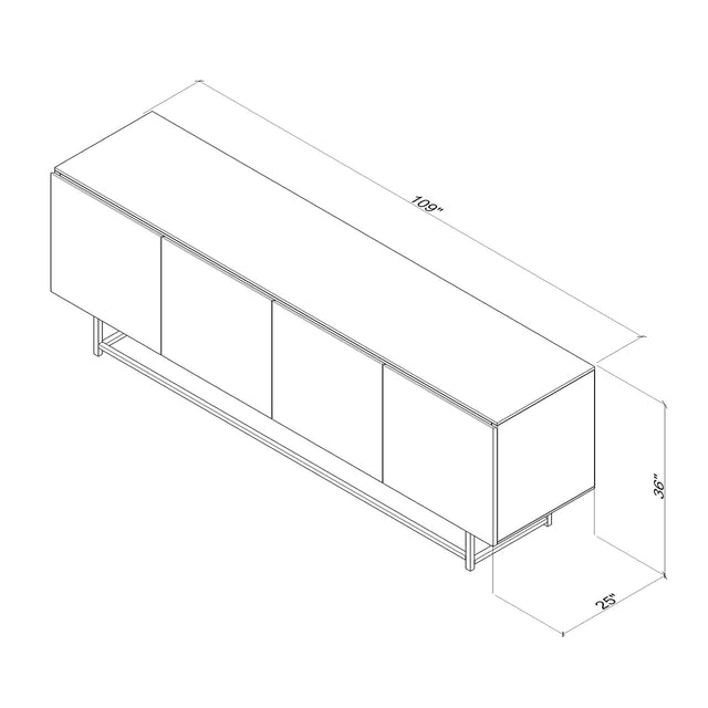 Enjoy the experience a spacious credenza, measuring 109x25x36, with elegant wood and steel support. It offers four cabinet doors for ample storage, highlighting natural wood details, and a functional top surface.