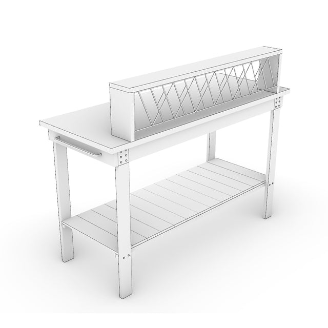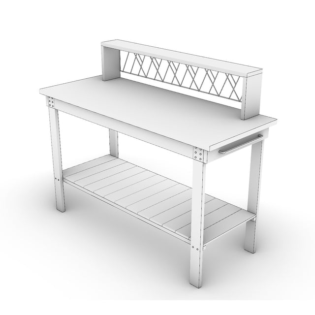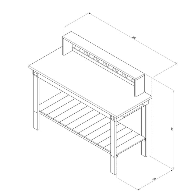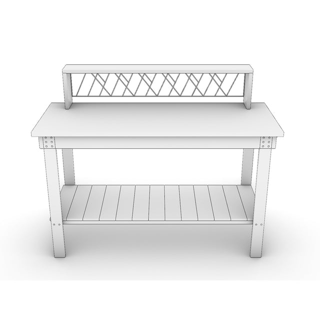 Grow your gardening endeavors with our functional gardening table, a down to earth design of natural wood and artful metal. This masterpiece blends utility and elegance, offering a canvas for nurturing nature. Crafted with precision, this table stands as a testament to practicality. The natural wood tabletop, a spacious haven, features thoughtful hooks on the side for tool hanging, bringing fluidity to your gardening tasks. Below the tabletop, a slatted shelf provides storage while adding an organic touch. The back shelf offers unique storage with its metal lattice pattern which evokes a Two-Dimensional image of a forest. Cultivate your gardening passions with this blend of style and function.