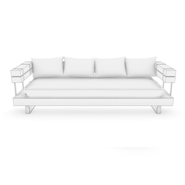 The support structure of this sofa is crafted from steel, evident in the durable legs, frame, and supports for the armrests. The sofa's seat platform is both sturdy and stable, featuring a straightforward yet gorgeous design that highlights natural lines in the wood. The generously sized armrests consist of two wooden posts stacked atop each other, secured by the steel supports, wrapping around the back for all-around stability.