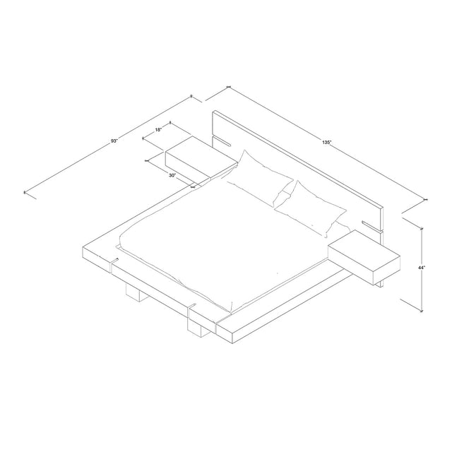The headboard and end tables (or floating shelves) are seamlessly integrated into the frame, creating a harmonious design. These shelves, measuring 30x18 each, offer convenient storage space for your essentials while resting partially on the platform, flanking the head of the bed. This bedframe is masterfully crafted, deserving of a place in your master suite.