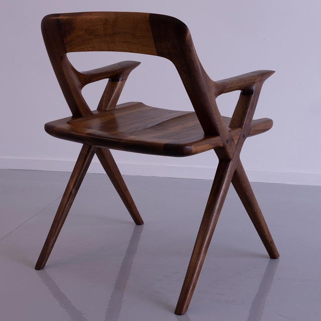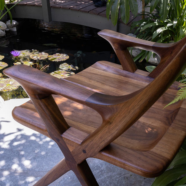 Redefine your space with the Arch Back Chair, a masterpiece with dimensions of 22x21x30 inches. This chair is shown in stunning walnut and is also available in Black Oak and Douglas Fir, all finished with a lustrous oil finish. It features remarkable natural lines that enhance its charm. While it displays beautiful wood grains, it also evokes the timeless appeal of a director's chair infused with class and the quintessential American aesthetic. This chair is a true statement piece, seamlessly blending an American Sensibility with impeccable craftsmanship, and excelling at both.