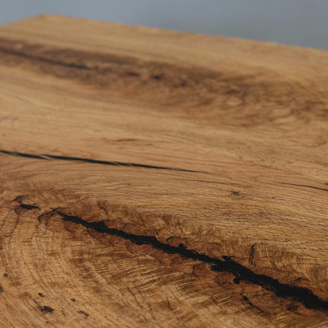 The Monte Nido Cocktail Table is a unique creation that utilizes crotch wood from black oak, showcasing incredible snakeskin figuring that is further enhanced with resin fill. Its wild and captivating top surface contrasts beautifully with the geometric transitions in the base, shifting from thin to thick along the length and across longitudinal sections.