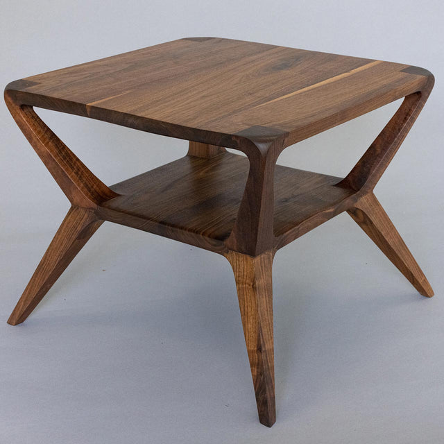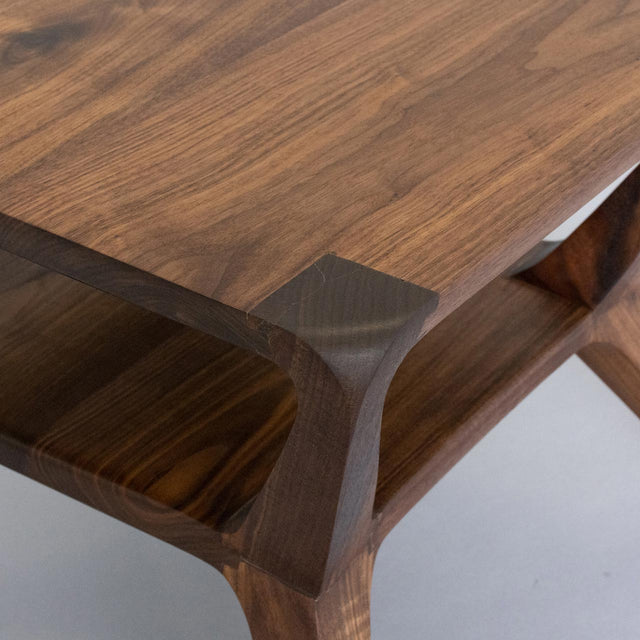 The Ray Base End Table represents a remarkable technical challenge, showcasing the skillful joining of components with displacement along all three axes. This piece features mortise and tenon joints, expertly holding the top and shelf in place without the need for any visible hardware. The table's construction is a testament to complexity within a simple and elegant form.