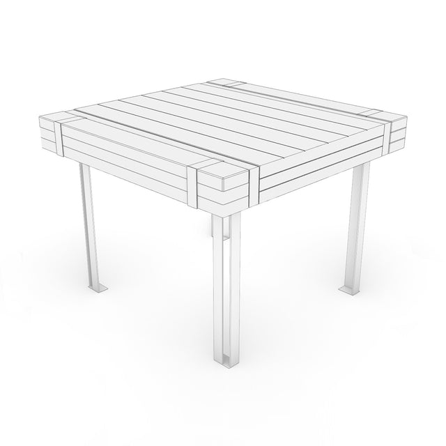 What sets this table apart is its unique steel framework. At each corner, two steel legs appear to stand independently but are gracefully connected at the base. They form two parallel steel frames that embrace the table from the top, creating an aesthetic that's both intriguing and functional. This table is a perfect companion for setting drinks and tapas, evoking the ambiance of a sophisticated winery.