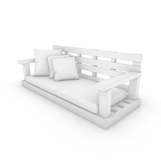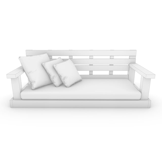 The swing features a classic lattice bench structure made of wood, showcasing the beautiful natural lines for which our designs are known. The overall aesthetic is both quaint and rustic, evoking a timeless feeling with a modern twist. A seat cushion and three pillows for back support add to the coziness, creating an inviting space for relaxation.