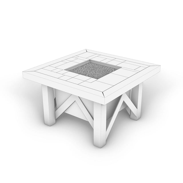 The tabletop itself is a work of art. It predominantly consists of a mosaic of differently colored tiles, each shaped as a four-sided piece and displaying various shades. The captivating variety of colors and shapes creates a visually stunning composition. In the center of this unique tabletop, there's a square stone basin designed to cradle a beautiful fire, making this fire table a one-of-a-kind outdoor piece.